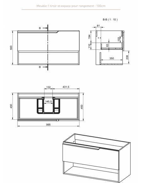 Ensemble meuble 1 tiroir + 1 étagère + vasque suspendus Eleven 100 cm Visobath