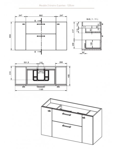 Ensemble meuble vasque 120 cm, Verso avec 2 tiroirs et 2 portes, poignées noires Visobath
