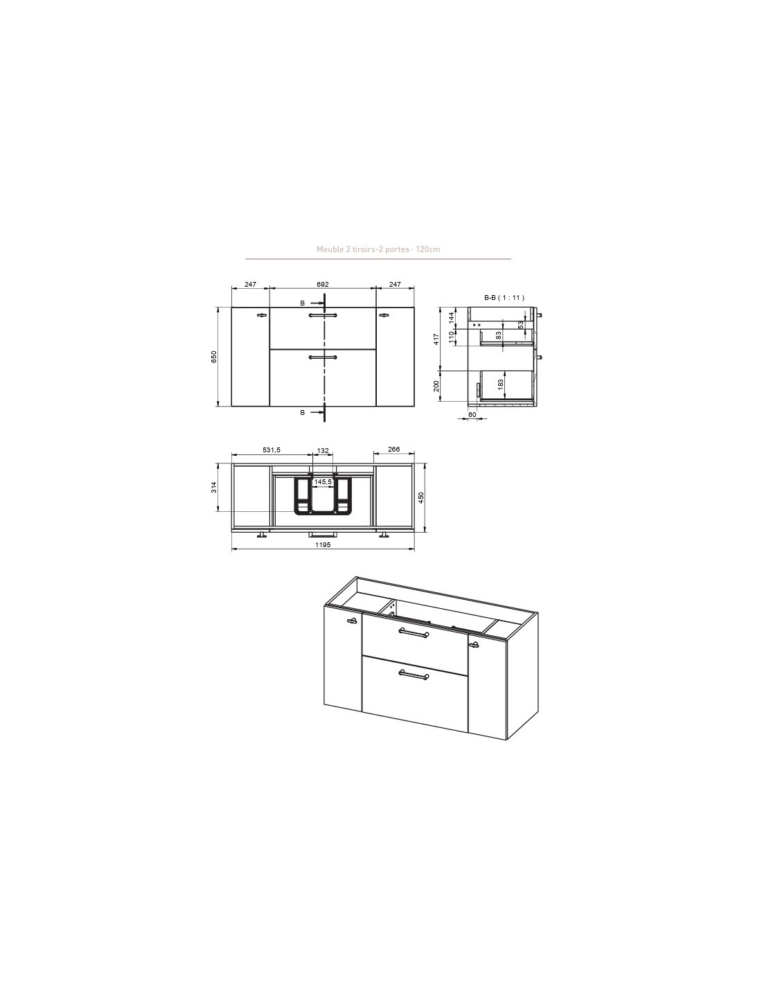 Ensemble meuble vasque 120 cm, avec 2 tiroirs et 2 portes, poignées noires Visobath
