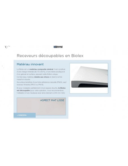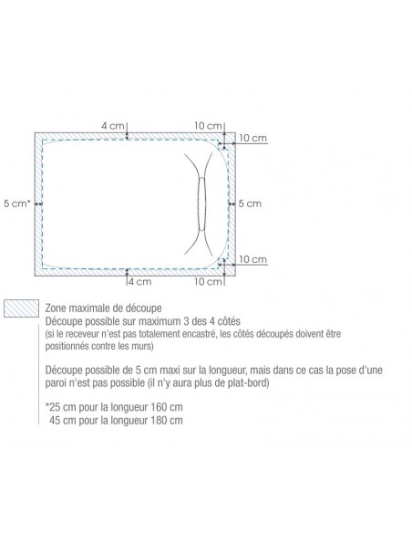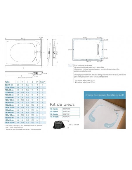 • Receveur découpable et perçable sur les contours si l’installation de la paroi le nécessite (pour cette opération, nous recommandons l’utilisation d'une meuleuse avec lame diamant ø 230 mm mini)